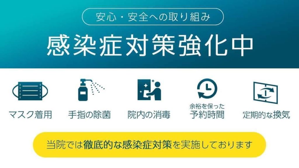 A 厚生労働省のHPを確認し、換気や手洗い、マスク、アルコール消毒など万全の感染対策を徹底し、営業しています。安心してご来院いただけるよう務めております。