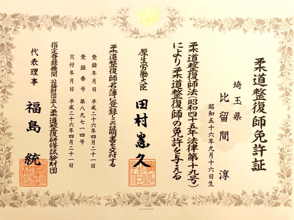 当院では、柔道整復師国家資格保有者の比留間が施術を行います。
