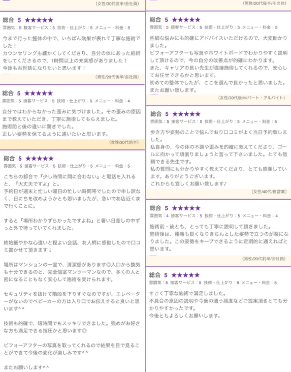 腰痛が酷く口コミもよかったので行ってみました!今まで行った整体の中で、いちばん効果が表れて丁寧な施術でした!カウンセリングも細かくしてくださり、自分の体にあった施術をしてくださるので、1時間以上の充実感がありました!今後もお世話になりたいと思います!