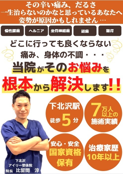 下北沢アイリー整体院院長の比留間です。